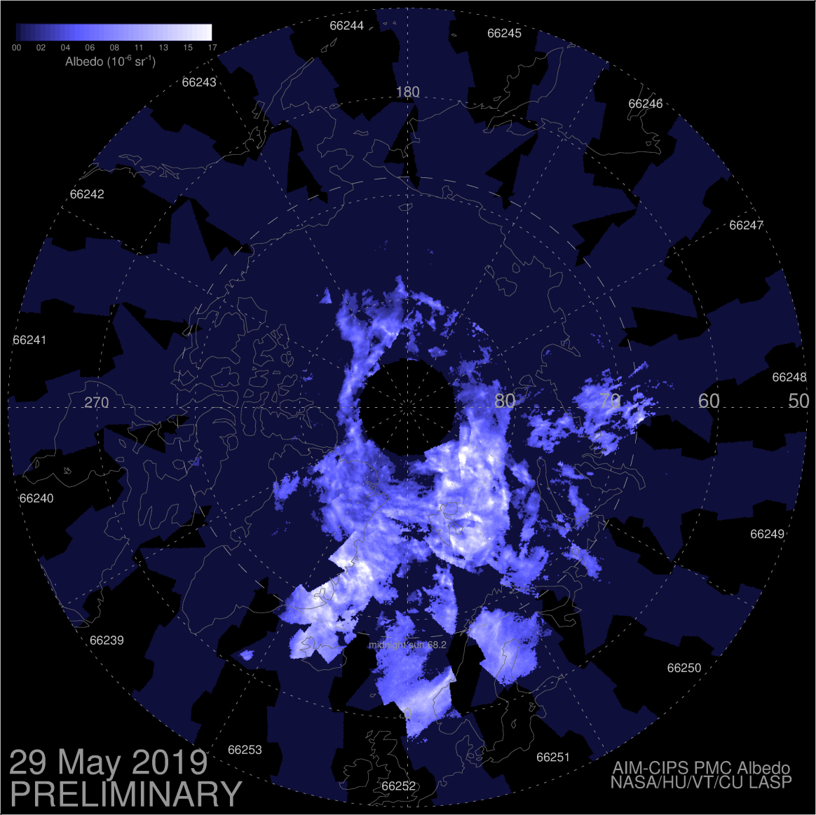 May 31, 2019: A huge blue cloud of frosted meteor smoke is pinwheeling around the Arctic Circle. NASA’s AIM spacecraft spotted its formation on May 20th, and it has since circled the North Pole one and a half times, expanding in size more than 200-fold. “These are noctilucent clouds,” says Cora Randall of the AIM … Continue reading Huge Blue Cloud Circles the North Pole