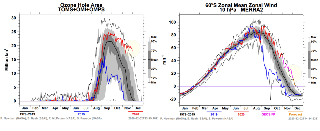 “The southern hemisphere stratosphere is very unusual this year,” says Randall. “The ozone hole is exceptionally large, until recently zonal winds have been blowing in the wrong direction, and overall the stratosphere is much more ‘winter-like’ than it should be in December.”