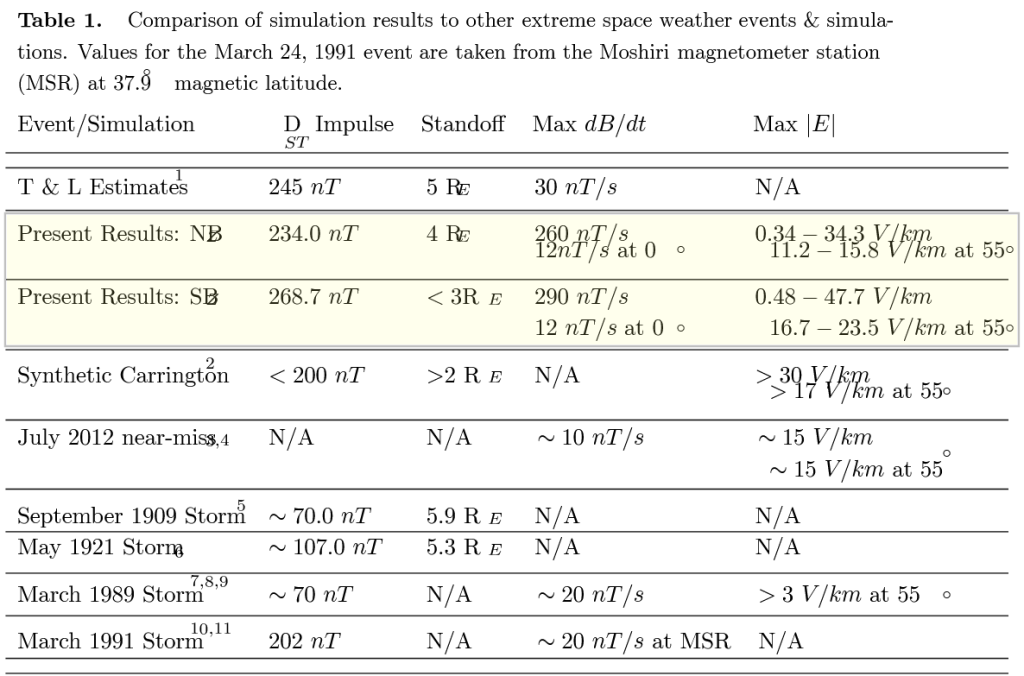 For specialists, Table 1 from Welling et al’s paper compares their simulation of a Perfect CME impact (highlighted in yellow) to past extreme events: