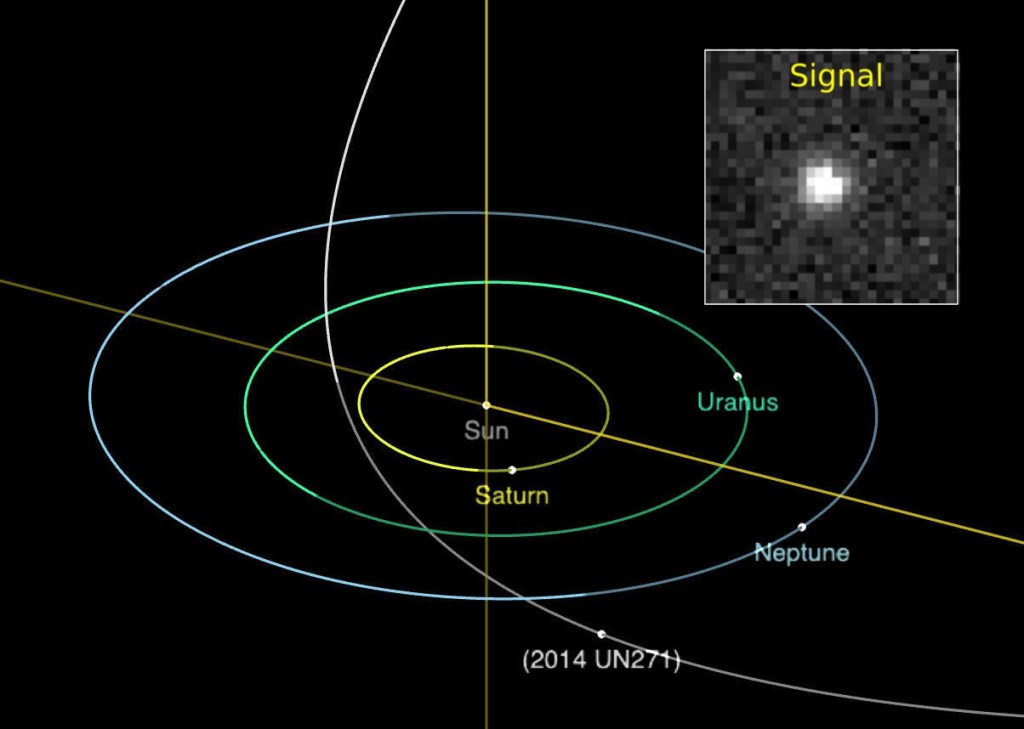 It’s still an amazing discovery. 2014 UN271 has an extremely elongated orbit stretching from ~the neighborhood of Saturn out to a staggering distance of almost a light year. At the far reaches of its orbit, 2014 UN271 barely feels the sun’s gravity and could be snatched out of the Solar System altogether by the ephemeral pull of galactic tides. Discovering such a traveler during its brief time among the planets is very lucky indeed.