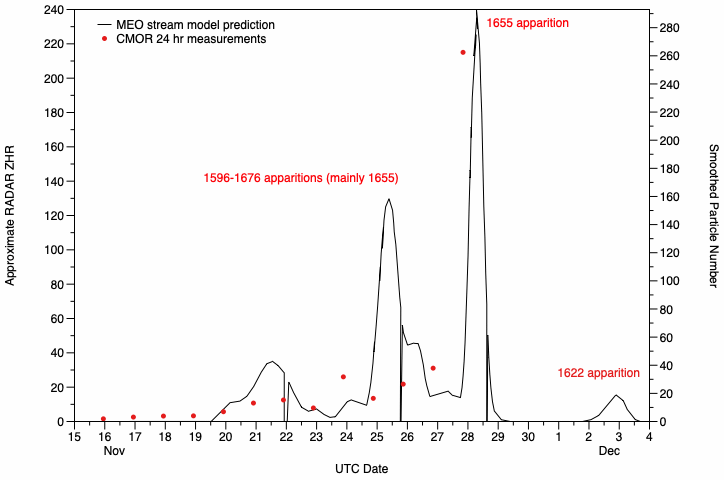Bill Cooke of NASA’s Meteoroid Environment Office (MEO) is one of several experts who have been modeling Biela’s debris streams, hoping to forecast a return. “Our models generally do not do well in predicting the timing or intensity,” he says. “However, this year our model got the timing roughly correct.” This plot shows current radar data (red dots) vs. predicted debris stream crossings: