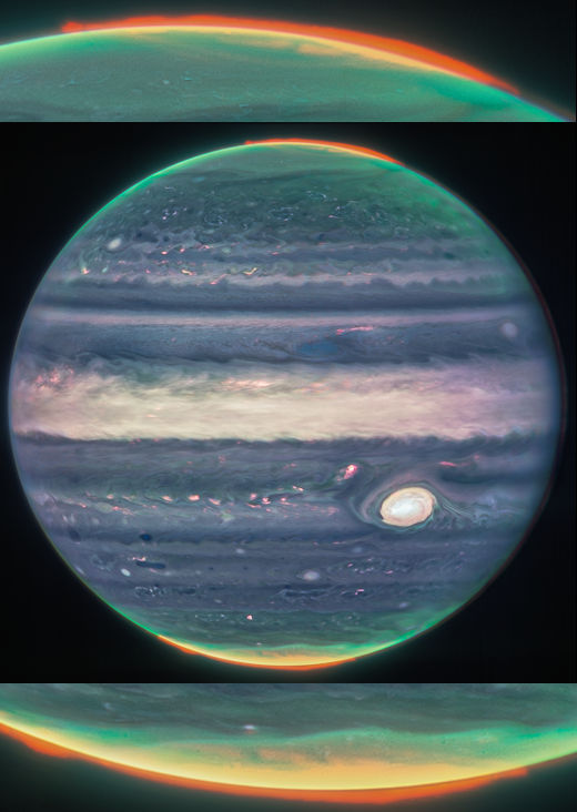 Two distinct auroras coexist over the poles of Jupiter: Ultraviolet auroras created by atmospheric hydrogen in its molecular form (H2) and infrared auroras created by the hydrogen ion H3+. JWST saw the infrared variety. In fact, the telescope is well instrumented to monitor these auroras. Its Near-Infrared Camera (NIRCam) has a filter that nicely captures the 3.3 to 3.6 micron glow of H3+.