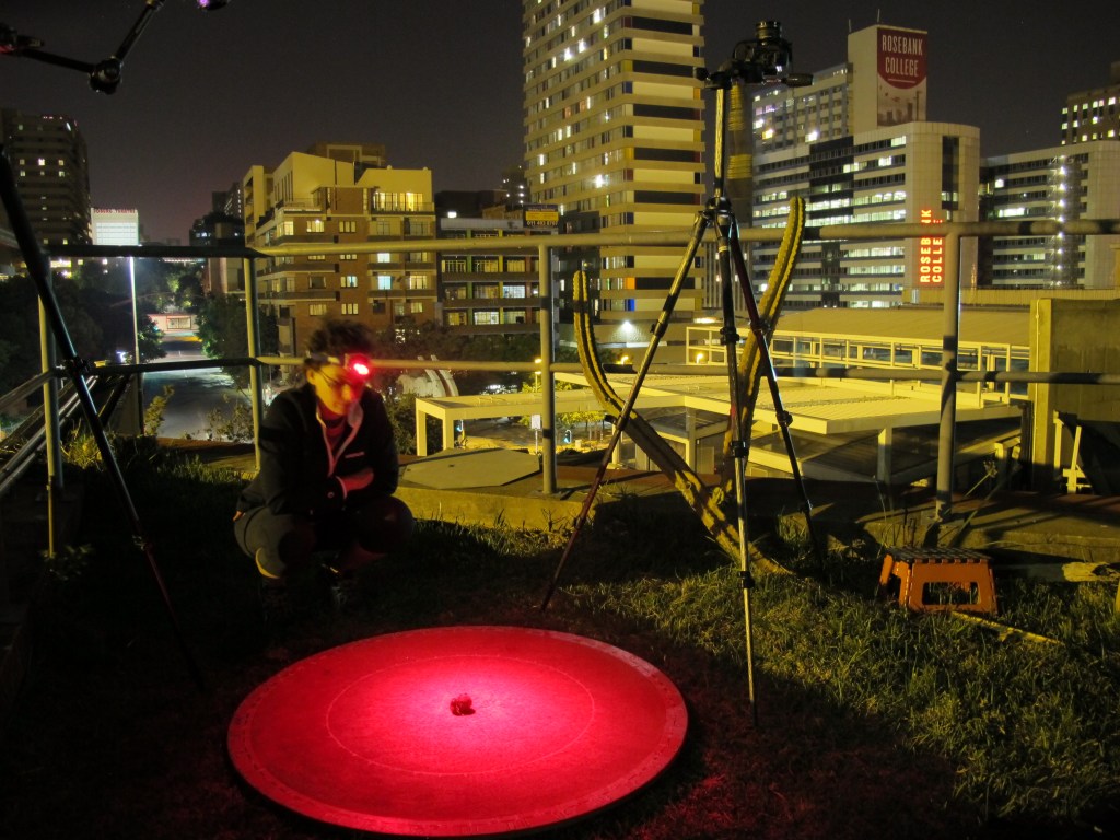 Above: Claudia Tocco, a colleague of James Foster, performing experiments on the roof of the University of the Witwatersrand in central Johannesburg. A dung beetle is at the center of the red-lit arena. Photo credit Marcus Byrne