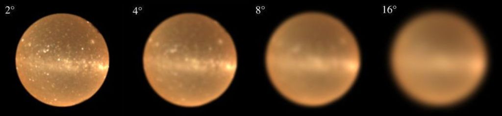 Above: Dung beetle vision blurs the Milky Way, but no one is certain how much. These are four models used in the experiments of James Foster. Models in the 2o to 4o smoothing range seem to best represent how the beetles see the sky.