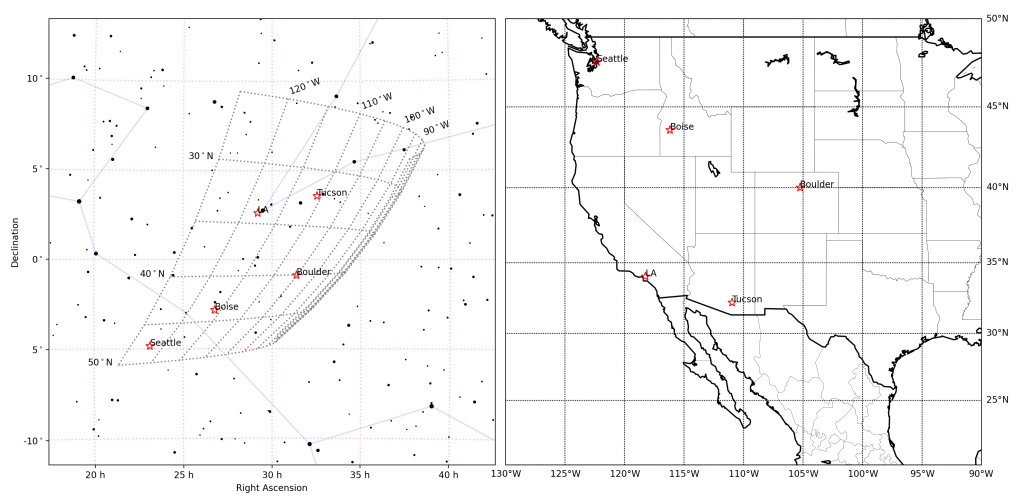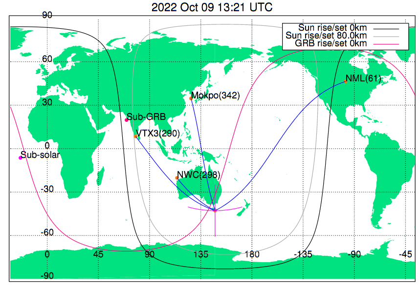 “During the gamma-ray burst I detected flickering from multiple stations,” says Klekociuk, who made this map showing transmission paths illuminated by the GRB: