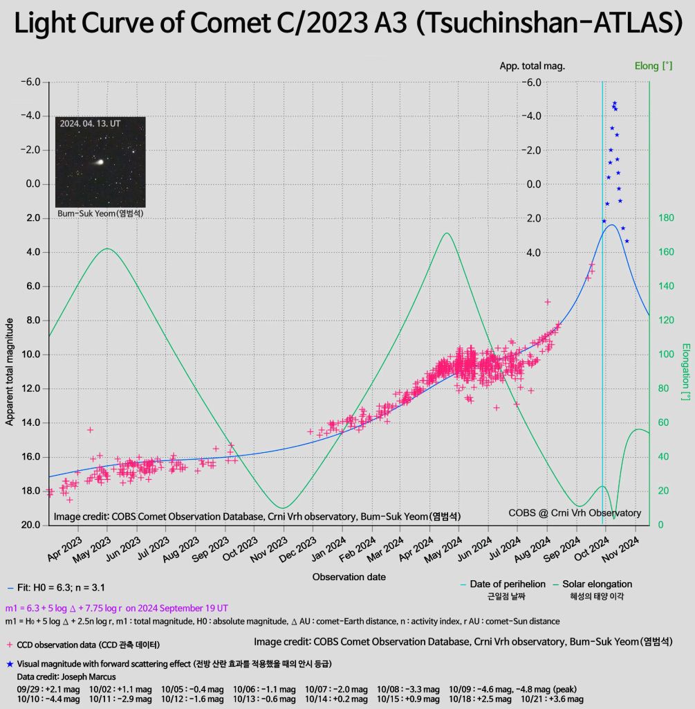 Above: This light curve from astronomer Bum-Suk Yeom shows a huge spike in the comet’s brightness around Oct. 9-10. [more]